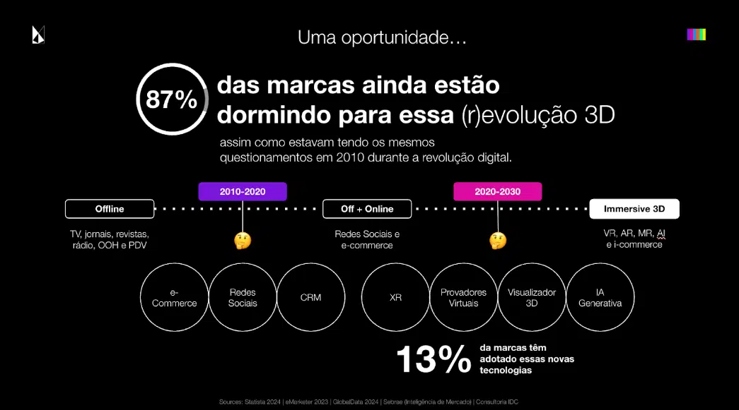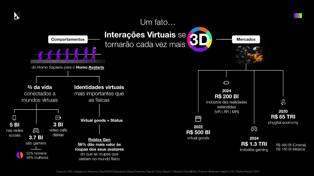 Além disso, projeções do Citi indicam que o mercado de realidades estendidas e itens virtuais deve superar R$ 65 trilhões até 2030. Ou seja: estamos diante de uma nova economia digital, onde marcas que não criarem presença tridimensional correm o risco de desaparecer.