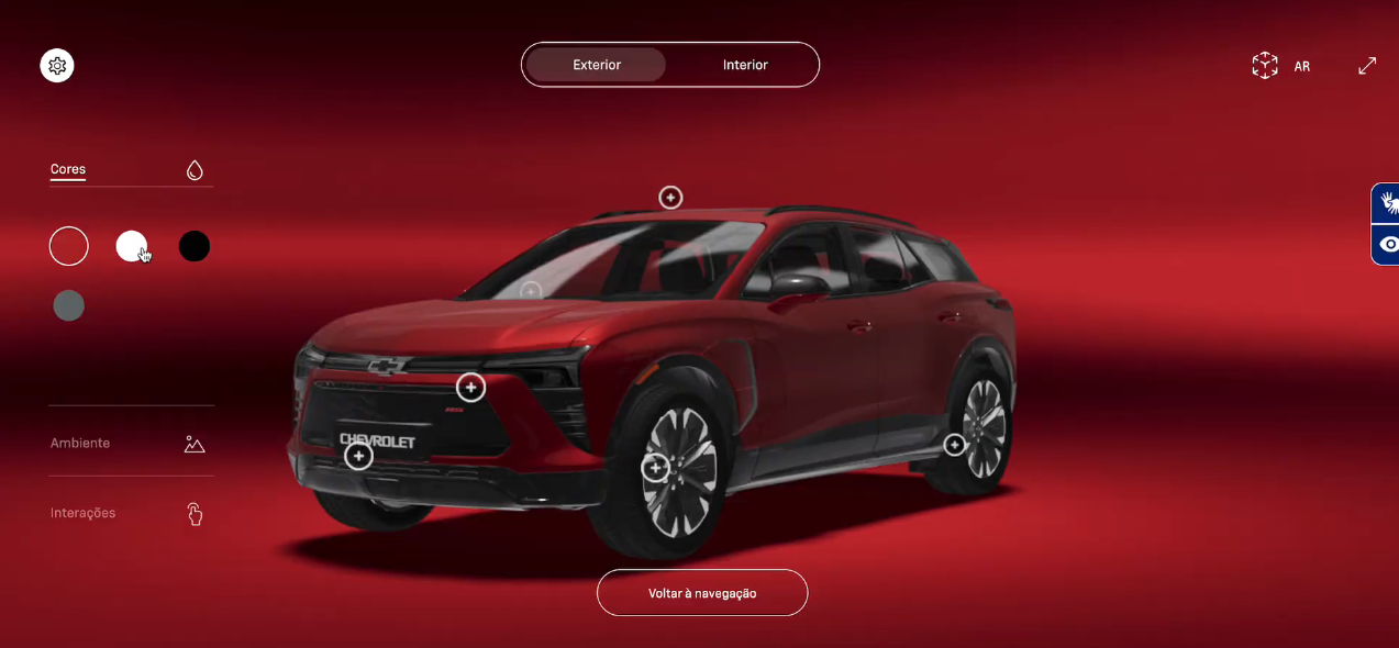 A Chevrolet usa o mK 3D para mostrar o Equinox elétrico em quatro cores. O usuário visualiza o exterior e o interior, simula a abertura das portas e pode projetar o carro na própria garagem usando a câmera do celular.