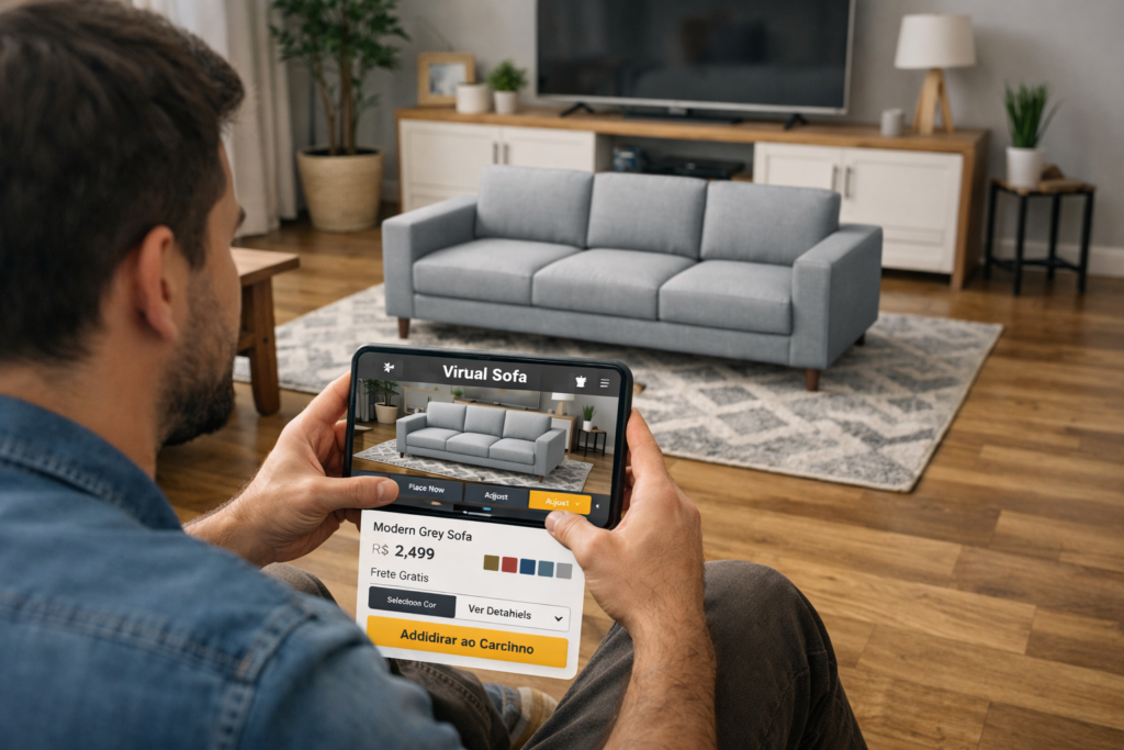 A realidade aumentada (AR) é a tecnologia que sobrepõe objetos digitais ao ambiente físico em tempo real. No e-commerce, isso significa que o consumidor pode ver o produto exatamente como ficaria na vida real, antes de comprar.