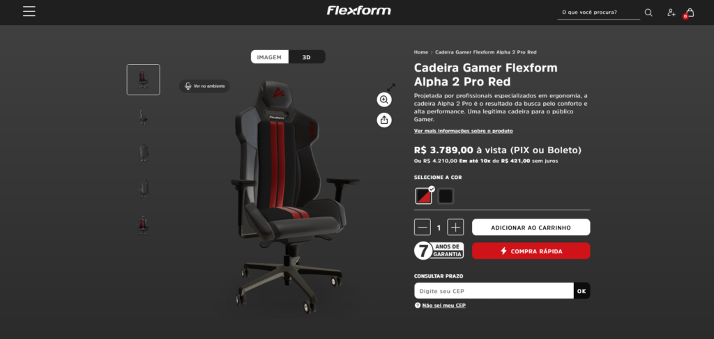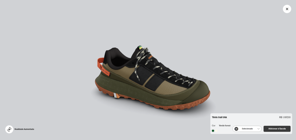 - Para calçados: O consumidor clica em “Visualizar 3D”, manipula o tênis em 360 graus, dá zoom no solado e depois escaneia um QR code para projetar o produto no próprio pé usando a câmera do celular.