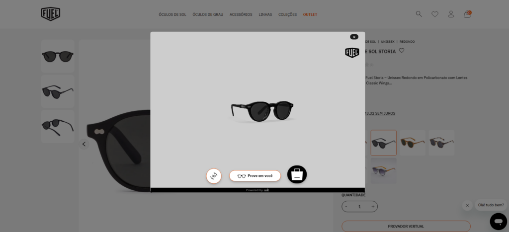 A marca de óculos adicionou um provador virtual na página de produto. Ao clicar, um popup abre carregando o modelo 3D em tempo real, sem impactar a velocidade de carregamento inicial da página.